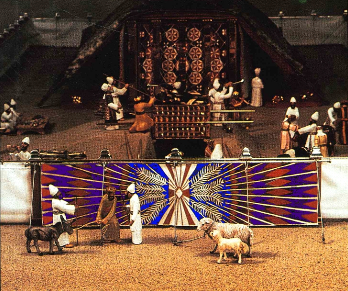 출애굽기 27:16에서 성막 문은 가는 배실로 짜여졌으며, 청색, 자색, 홍색 실로 수놓아진 휘장으로 만들어졌습니다.