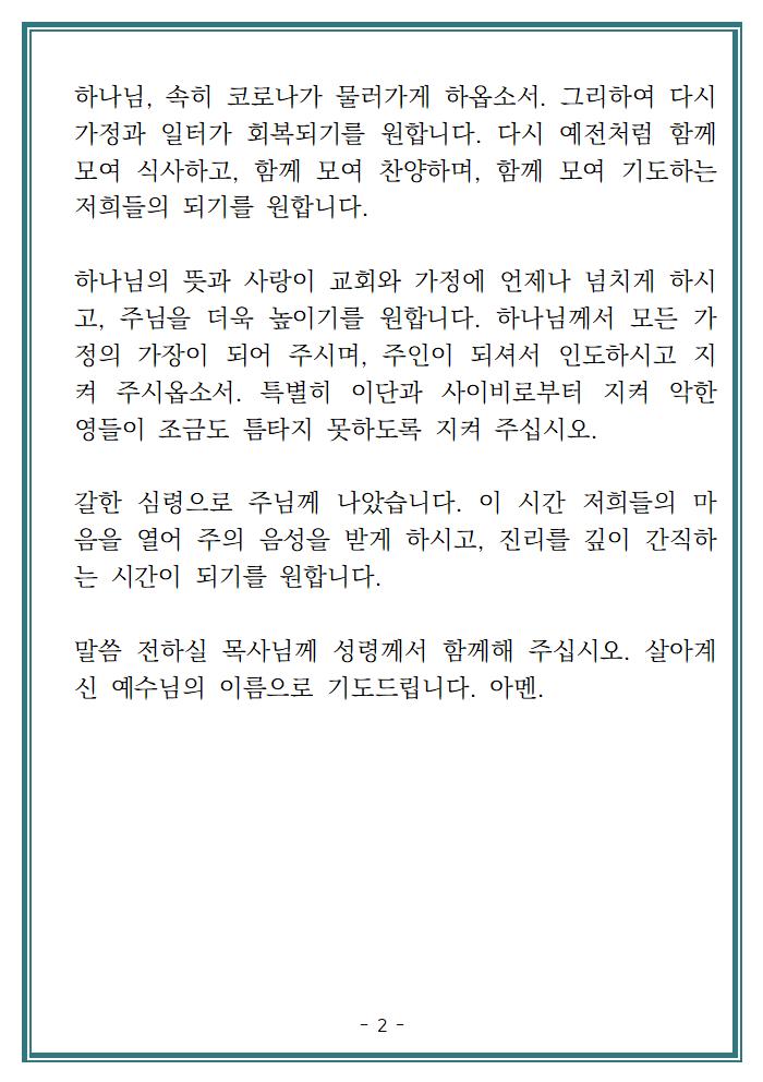 사랑의 하나님 오늘도 주의 전에 모여 예배하게 하심을 감사드립니다. 코로나로 인해 모이지 못하고 온라인으로 예배드리지만 온 성도가 한 마음으로 주님을 예배하게 하심을 찬양합니다.
