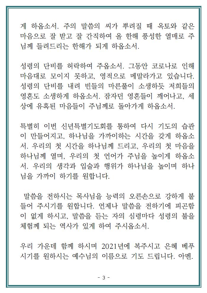 특별히 이번 신년특별기도회를 통하여 다시 기도의 습관이 만들어지고, 하나님을 가까이하는 시간을 갖게 하옵소서. 우리의 첫 시간을 하나님께 드리고, 우리의 첫 마음을 하나님께 열며, 우리의 첫 언어가 주님을 높이게 하옵소서. 우리의 생각과 입술과 행위가 하나님을 높이며 하나님을 가까이 하기를 원합니다.