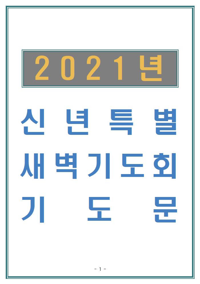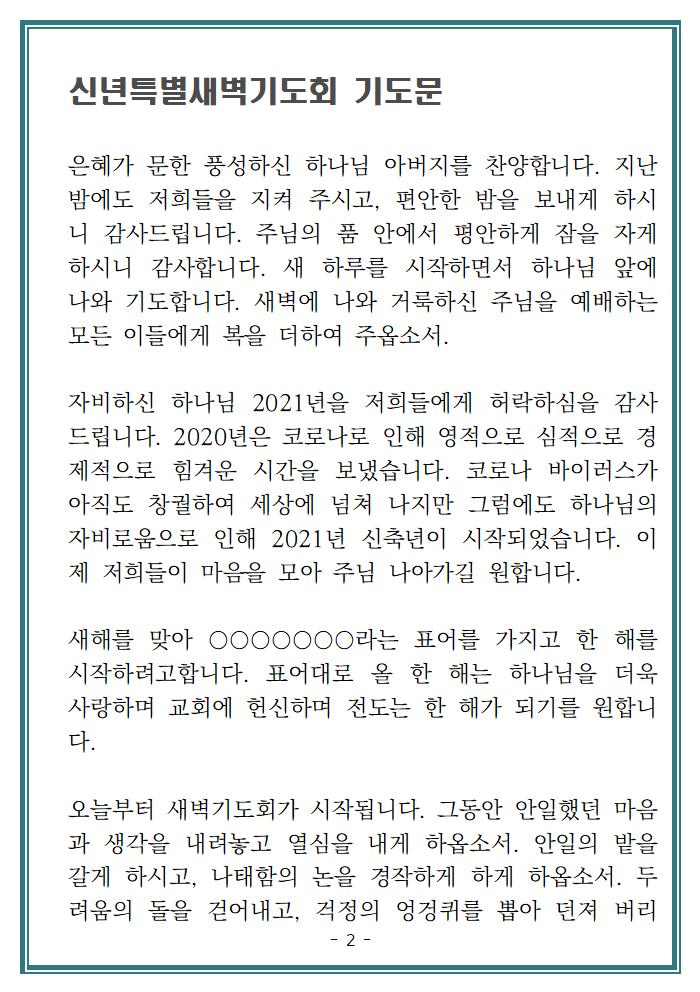 자비하신 하나님 2021년을 저희들에게 허락하심을 감사드립니다. 2020년은 코로나로 인해 영적으로 심적으로 경제적으로 힘겨운 시간을 보냈습니다. 코로나 바이러스가 아직도 창궐하여 세상에 넘쳐 나지만 그럼에도 하나님의 자비로움으로 인해 2021년 신축년이 시작되었습니다. 이제 저희들이 마음을 모아 주님 나아가길 원합니다.