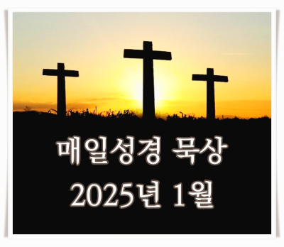 아래의 이미지를 클릭하시면 2025년 1월 매일성경 본문표를 보실 수 있습니다. 각 날짜와 본문을 클릭하시면 본문에 해당되는 묵상 글을 볼 수 있도록 했습니다.