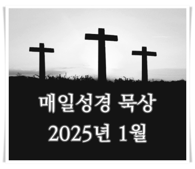 아래의 이미지를 클릭하시면 2025년 1월 매일성경 본문표를 보실 수 있습니다. 각 날짜와 본문을 클릭하시면 본문에 해당되는 묵상 글을 볼 수 있도록 했습니다.