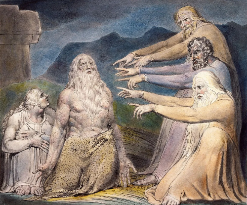 욥의 세 친구 엘리바스, 빌닷, 소발은 각각 인간의 전통적 지혜와 경험을 바탕으로 욥의 고난을 해석하려고 합니다. 그들은 욥의 고난을 죄의 결과로 간주하며, 욥에게 회개를 촉구합니다. 엘리바스는 개인적인 경험과 신비한 계시를 통해 고난의 원인을 설명하려 하고(욥 4:12-17), 빌닷은 조상들의 전통적 지혜를 인용하며 죄와 고난의 인과관계를 강조합니다(욥 8:8-10). 소발은 욥의 말을 감정적으로 반박하며 욥이 자신의 죄를 숨기고 있다고 단정합니다(욥 11:6).