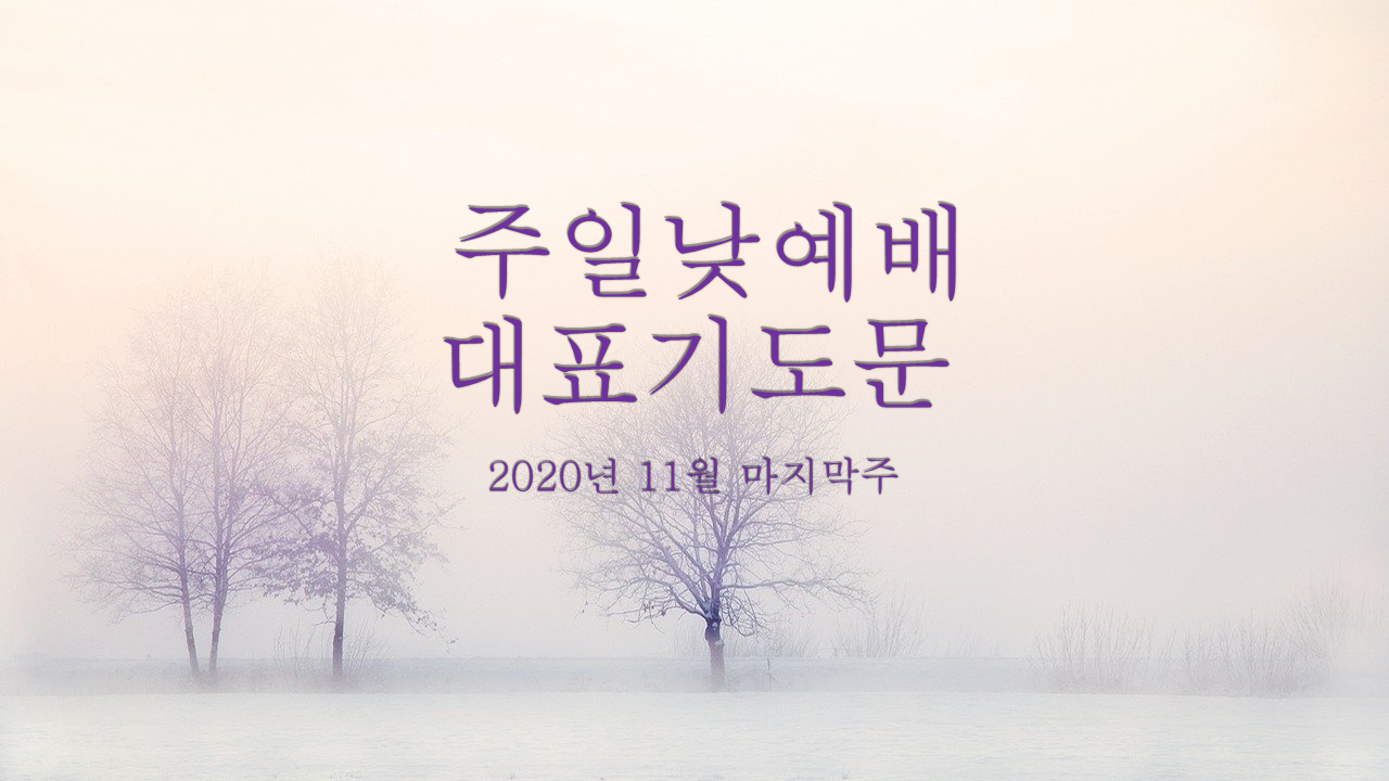 오늘은 11월 마지막 주 주일입니다. 지나온 시간을 돌이켜 보니 모두가 하나님의 은혜였습니다. 시작이 있으면 끝이 있다 했지만 끝은 언제나 아쉽습니다. 11월 동안 저희들이 얼마나 주님을 기쁘게 했는지, 얼마나 주의 일에 열심이었는지 돌아보니 아쉽고 섭한 마음뿐입니다. 우리에게 주어진 하루의 일상들을 무의미하게 흘려보내는 어리석을 범하지 않게 하옵소서. 남겨진 시간들을 주님을 위해, 교회를 위해 수고하며 애쓰게 하옵소서.